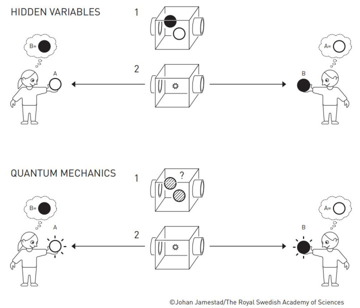 量子力学中的纠缠对可以比作一台向相反方向抛出颜色相反球的机器。当鲍勃接到一个球并看到它是黑色的时,他立刻就知道爱丽丝接到了一个白球。在一种使用隐变量的理论中,这些球一直包含着关于其颜色的隐藏信息。然而,量子力学认为,这些球在被观察之前是灰色的,或者黑白相间的,直到有人观察它们时,一个球随机变成白色,另一个变成黑色。贝尔不等式表明,存在一些实验可以区分这两种情况。这些实验已经证明量子力学的描述是正确的,球的颜色在测量之前是不确定的。图片来源:Johan Jamestad/瑞典皇家科学院