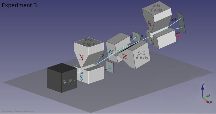 当具有量子自旋的粒子穿过定向磁体时,它至少会沿两个方向分裂,具体方向取决于自旋方向。如果再沿相同方向放置一个磁体,则不会发生进一步分裂。然而,如果在两个磁体之间垂直放置第三个磁体,粒子不仅会沿新的方向分裂,而且之前获得的关于原始方向的信息也会被破坏,导致粒子在穿过最后一个磁体时再次分裂。单个粒子的偏转方向无法预先得知,只能通过测量来确定。图片来源:MJasK/Wikimedia Commons