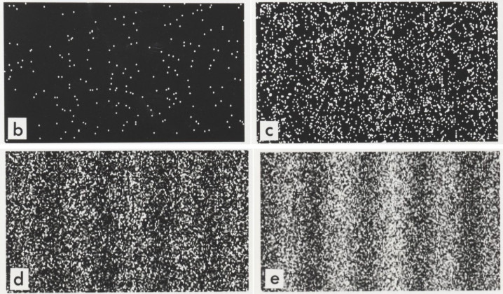 电子依次通过双缝干涉仪时,双缝均打开,电子可以同时通过。如果测量电子通过的是哪个缝,就会破坏图中所示的量子干涉图样。然而,只要电子的德布罗意波长小于其通过的缝隙尺寸,这种波动性就依然存在。这种兼具波动性和粒子性的特性已在电子、光子甚至更大的复合粒子中得到证实。图片来源:Tonomura 博士;Belsazar/Wikimedia Commons